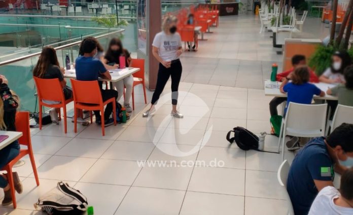 Este lunes se han viralizado imágenes de un grupo de estudiantes del colegio American School of Santo Domingo, a los que se le está impartiendo docencia en el área de comida de la plaza comercial Ágora Mall.